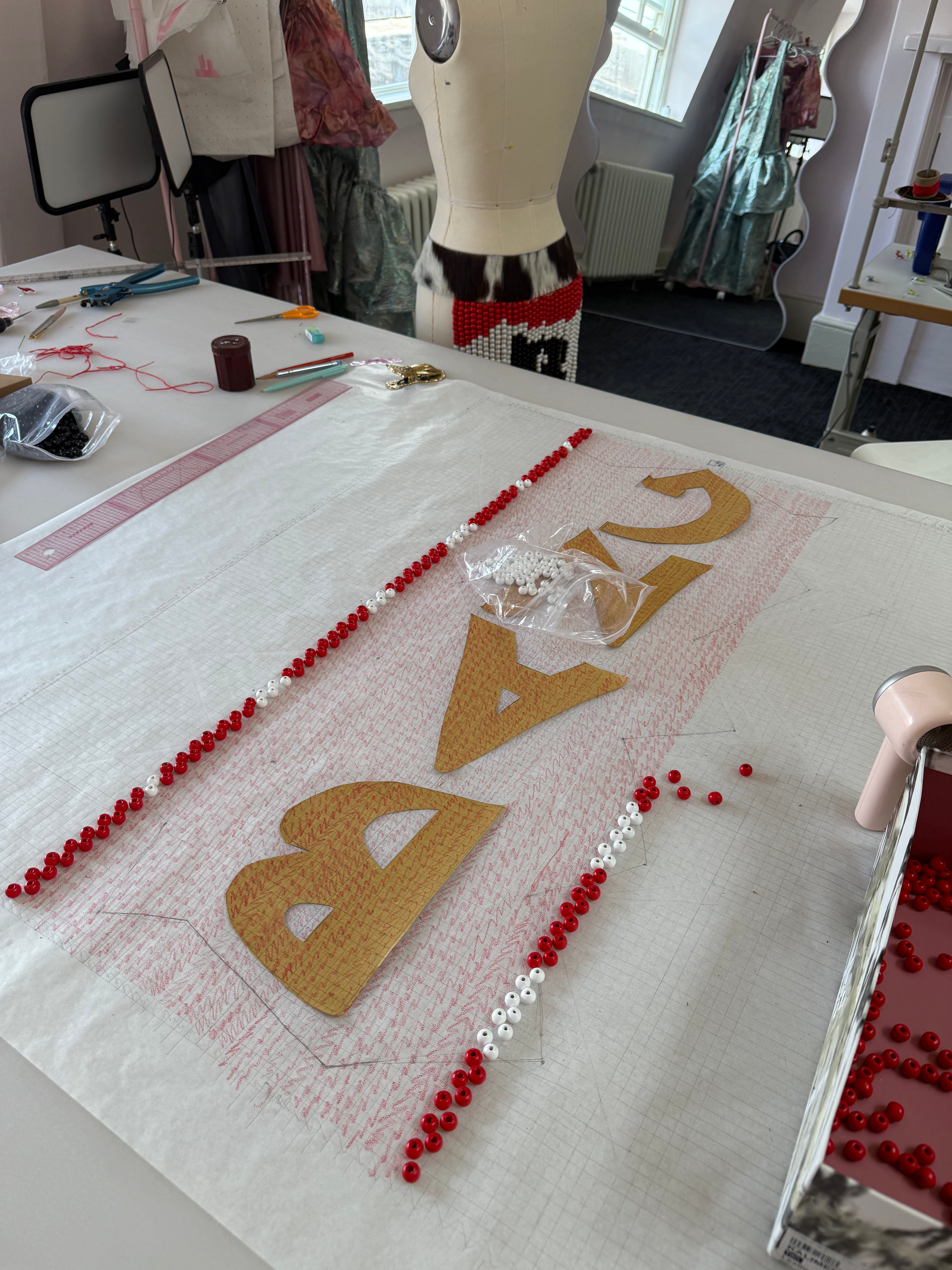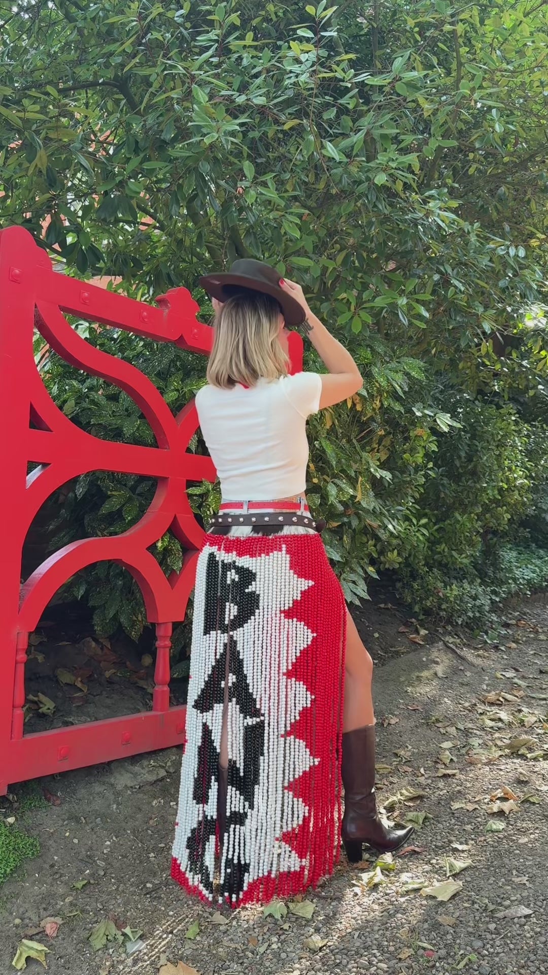 I made this Bang Skirt to wear to the Cowboy Carter tour. It was my nod to Beyoncé’s Super Bowl BANG moment mixed with a little cowboy fringe fantasy. It took hours of hand beading and was so fun to wear!