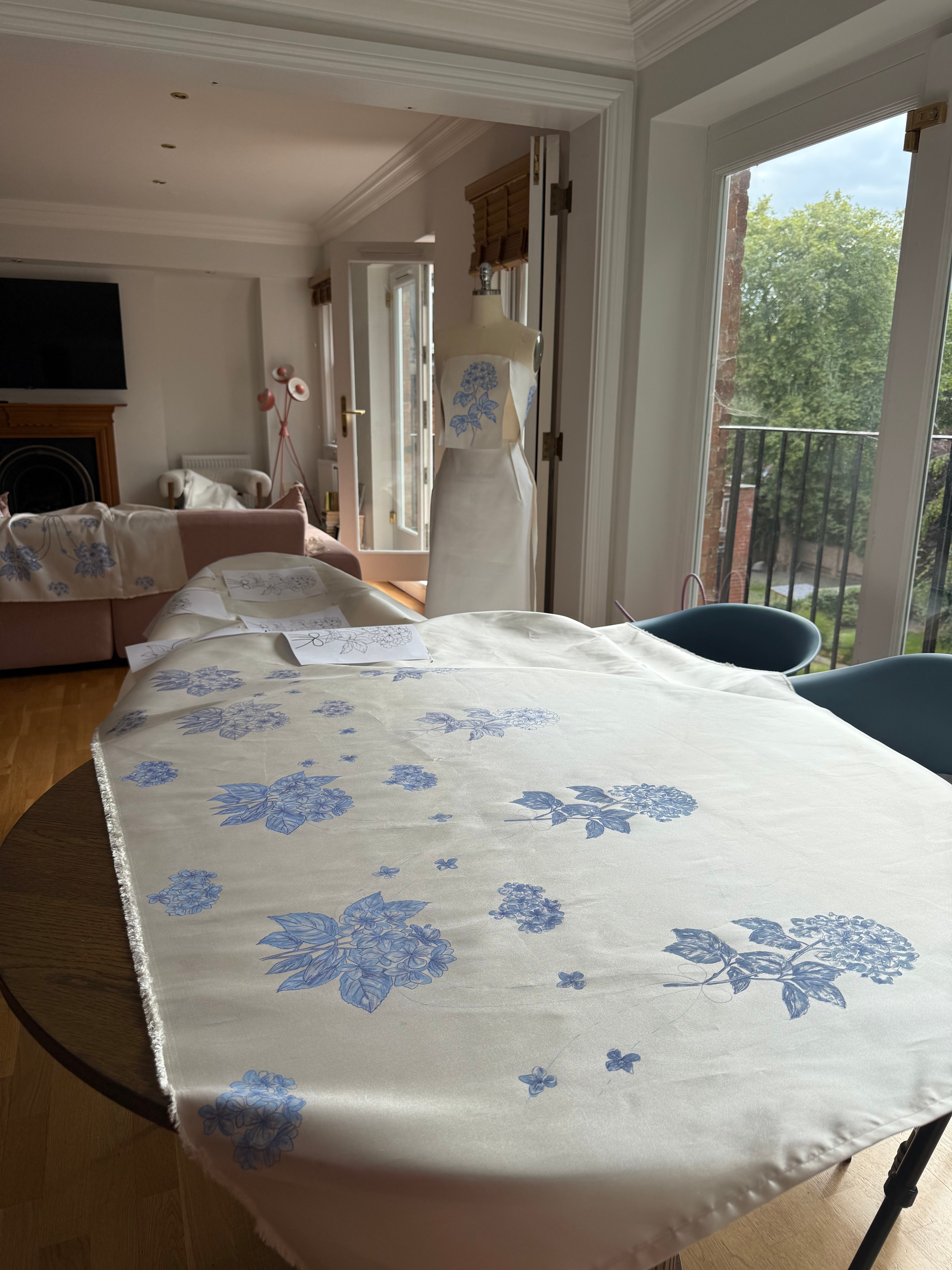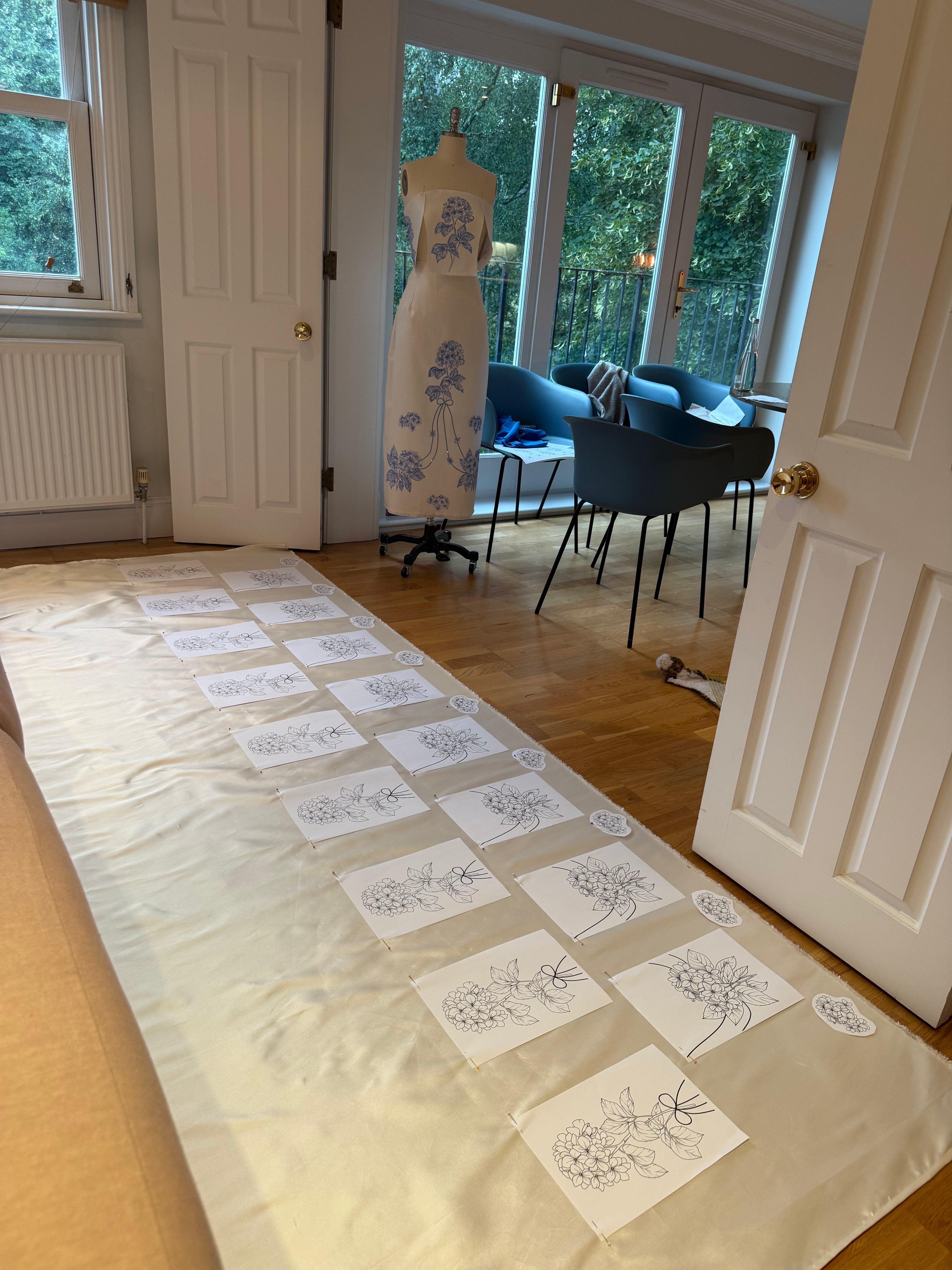 The base is 100% silk with hand painted flowers. Completely hand drawn and embellished by me (and some of my friends who helped bedazzle before episode 8!) this is truly one of a kind. My specialty. Separating zipper in the back with a clasped removable skirt.